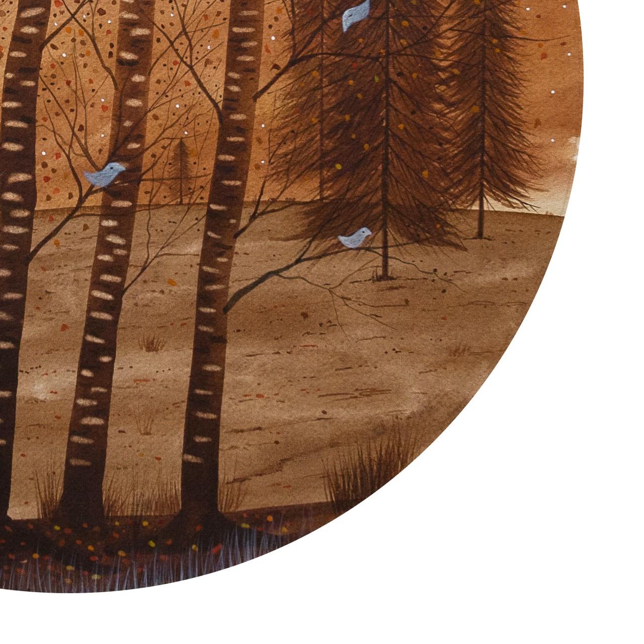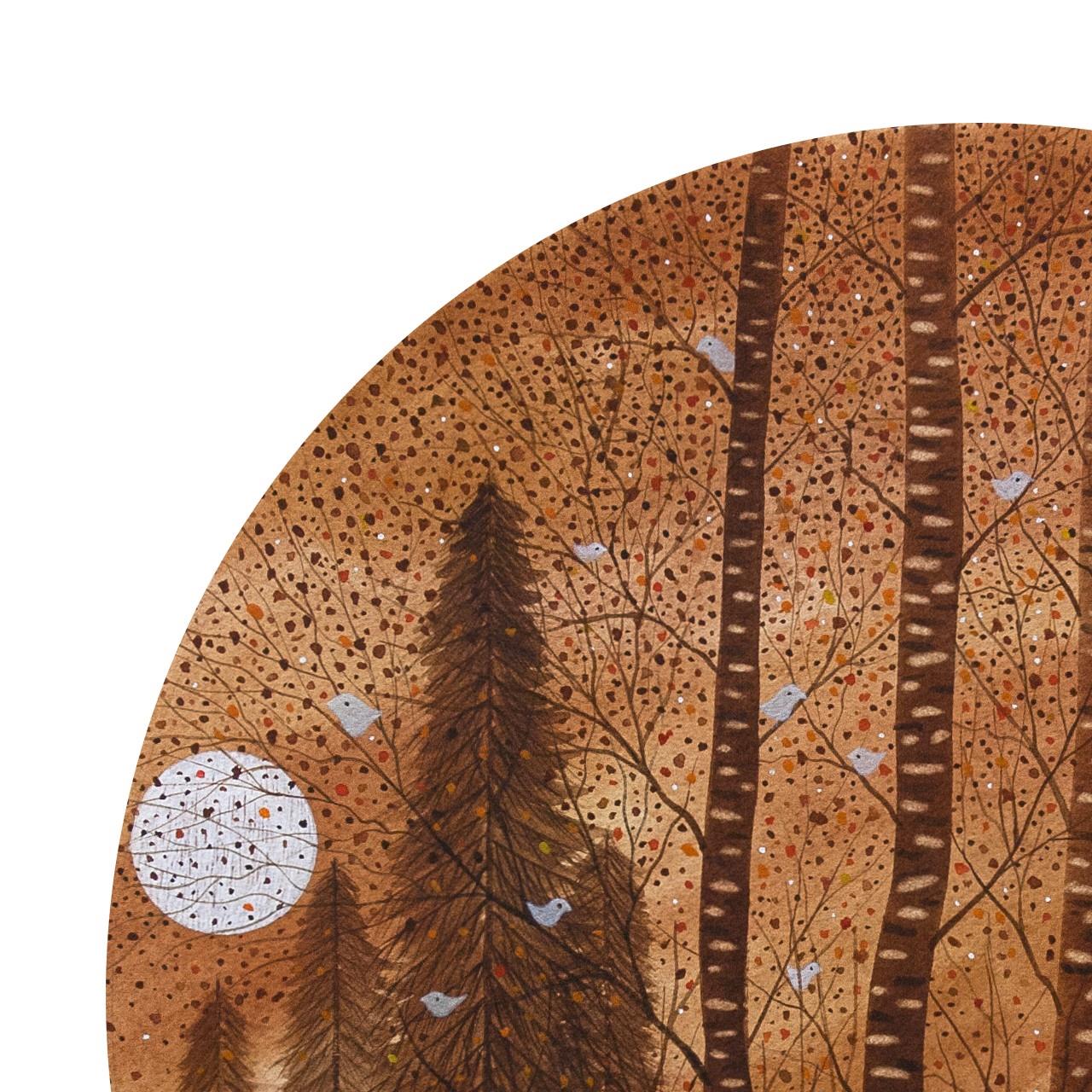 Un acquerello dai toni caldi con uccellini tra i rami autunnali, equilibrato e armonioso. Diametro 30cm. Realizzazione di Gabriele Casale, anno 2021.