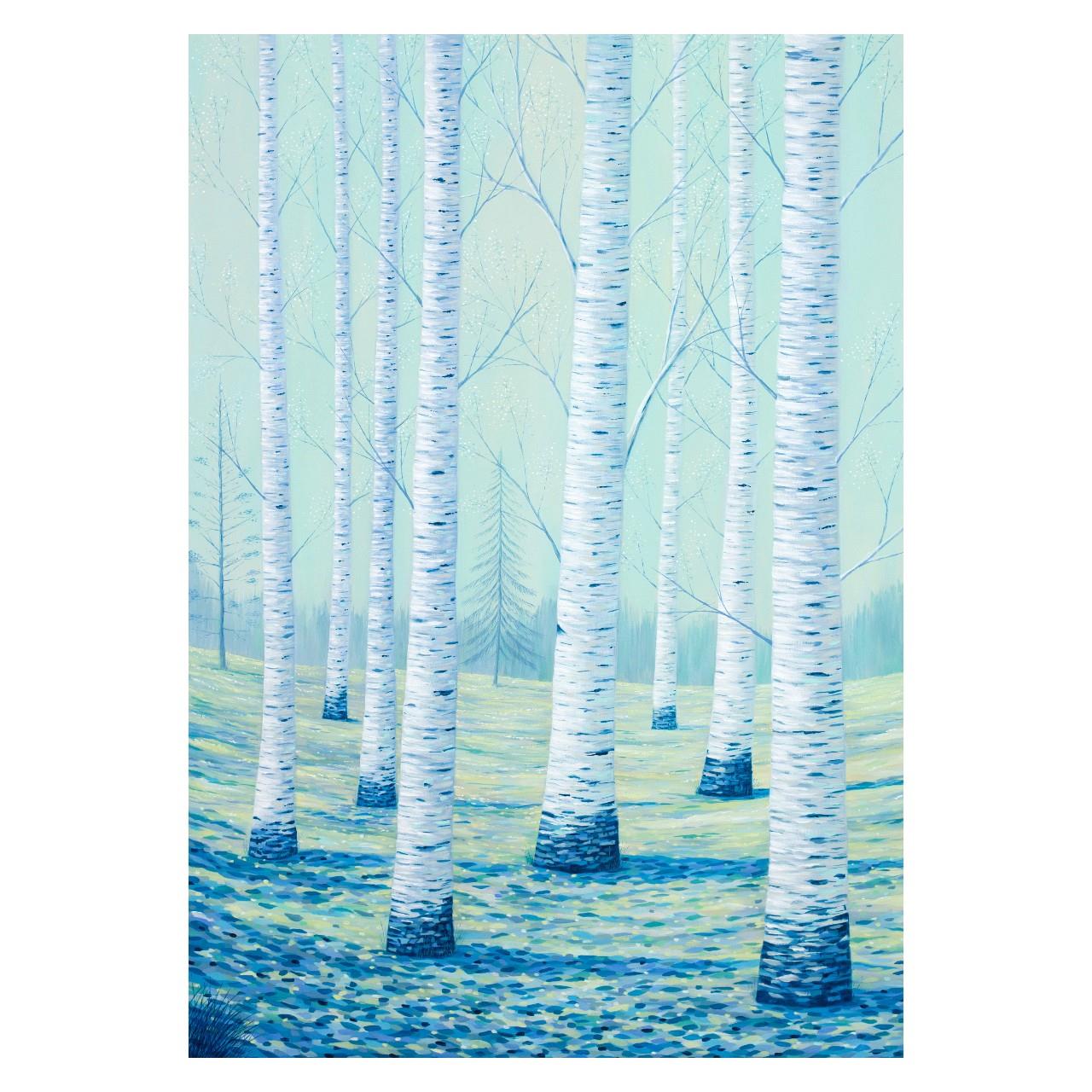 Un dipinto su tela che ritrae betulle immerse nelle prime ore del mattino. Dimensioni 70x100x4 cm. Realizzazione di Gabriele Casale, anno 2025.