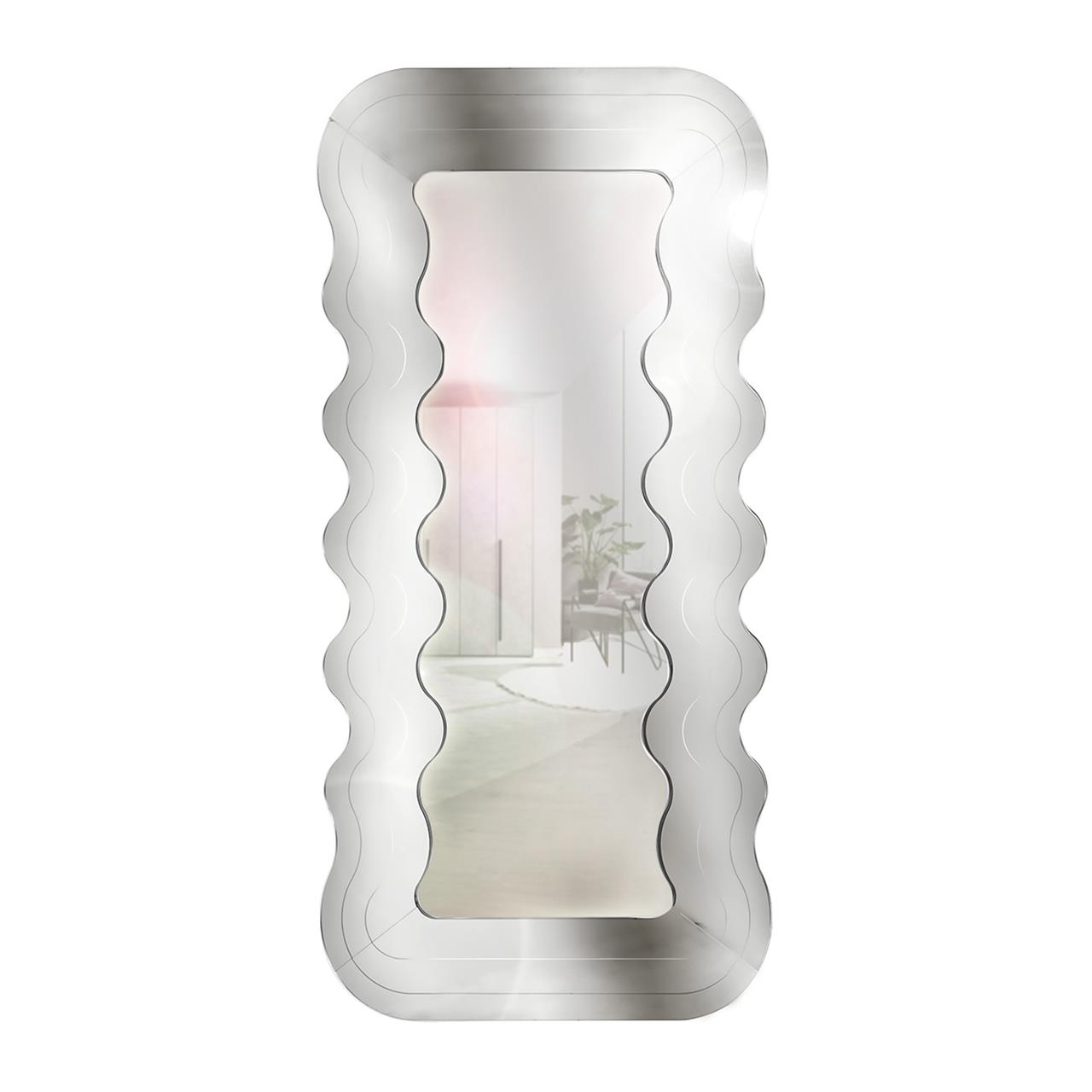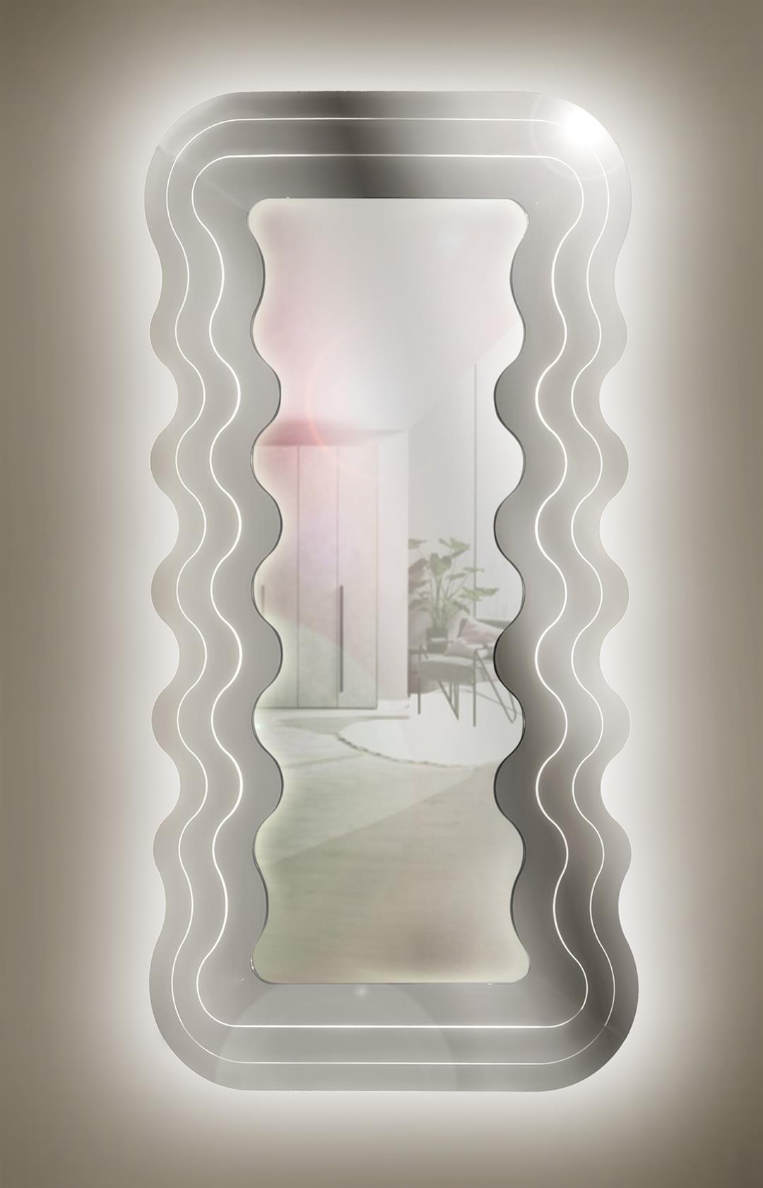 Richiami sinuosi e ondeggianti caratterizzano lo specchio da muro Marea, realizzato in plexiglass 100% da polimero vergine e sapientemente marcato