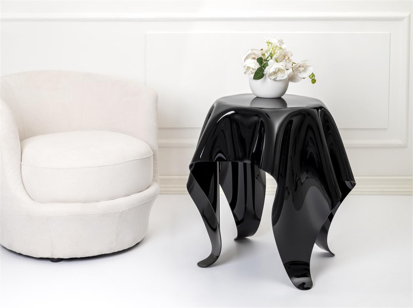 Ogni tavolino “Drappeggi d'autore" è un pezzo unico, un'opera d'arte moderna. Una lastra in purissimo polimero vergine 100% di plexiglass PMMA viene drappeggiata a mano ad alte temperature, sino a creare un tavolino unico ed irripetibile.