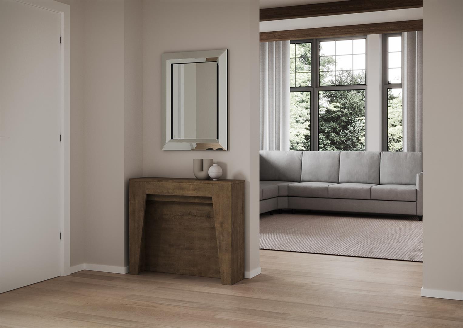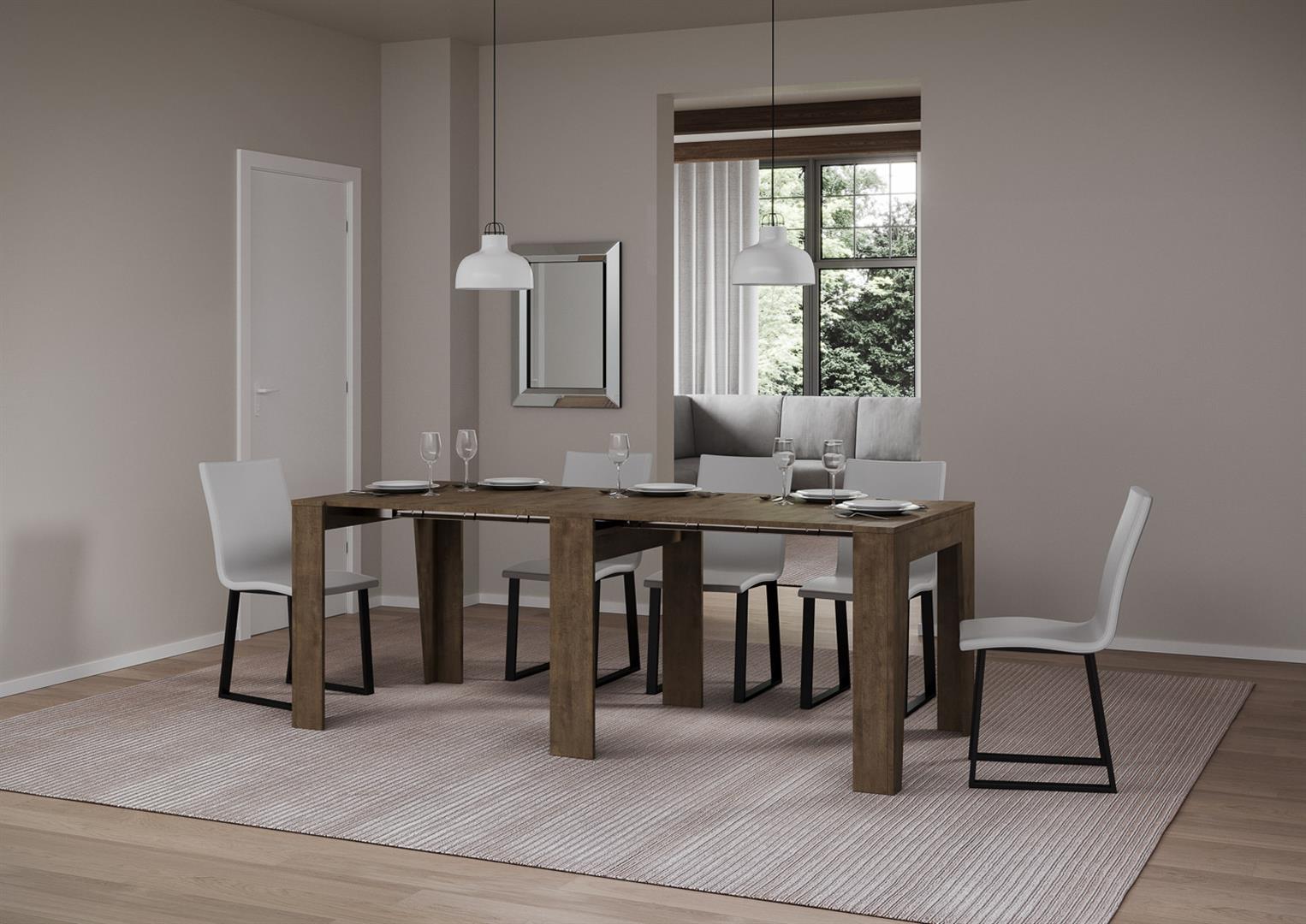 Consolle allungabile, versatile e robusta, un complemento perfetto per ogni ambiente della casa: ingresso, cucina, sala da pranzo, soggiorno o corridoio. La consolle allungabile può essere facilmente trasformata in un ampio tavolo da pranzo lungo fino a 211 cm, in grado di ospitare 10 persone. Realizzata con pannelli in nobilitato. Il sistema di allunghe con guide telescopiche in alluminio e il sostegno centrale in dotazione rendono la consolle stabile e robusta. Una volta che la consolle è chiusa, le allunghe da 62×86 cm trovano posto all'interno della struttura della consolle.