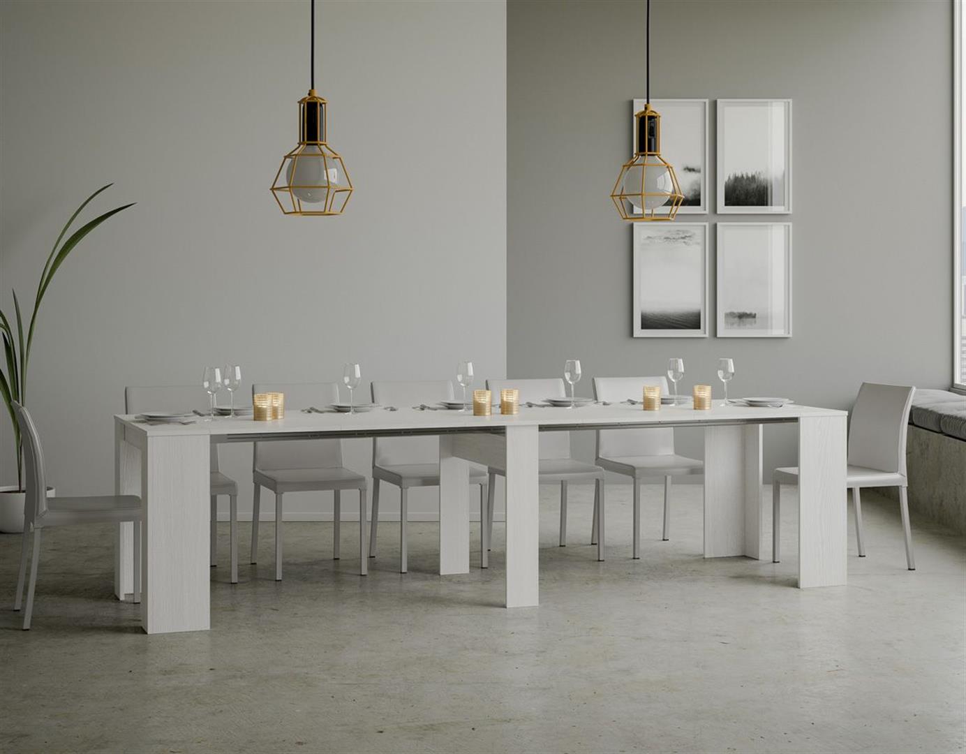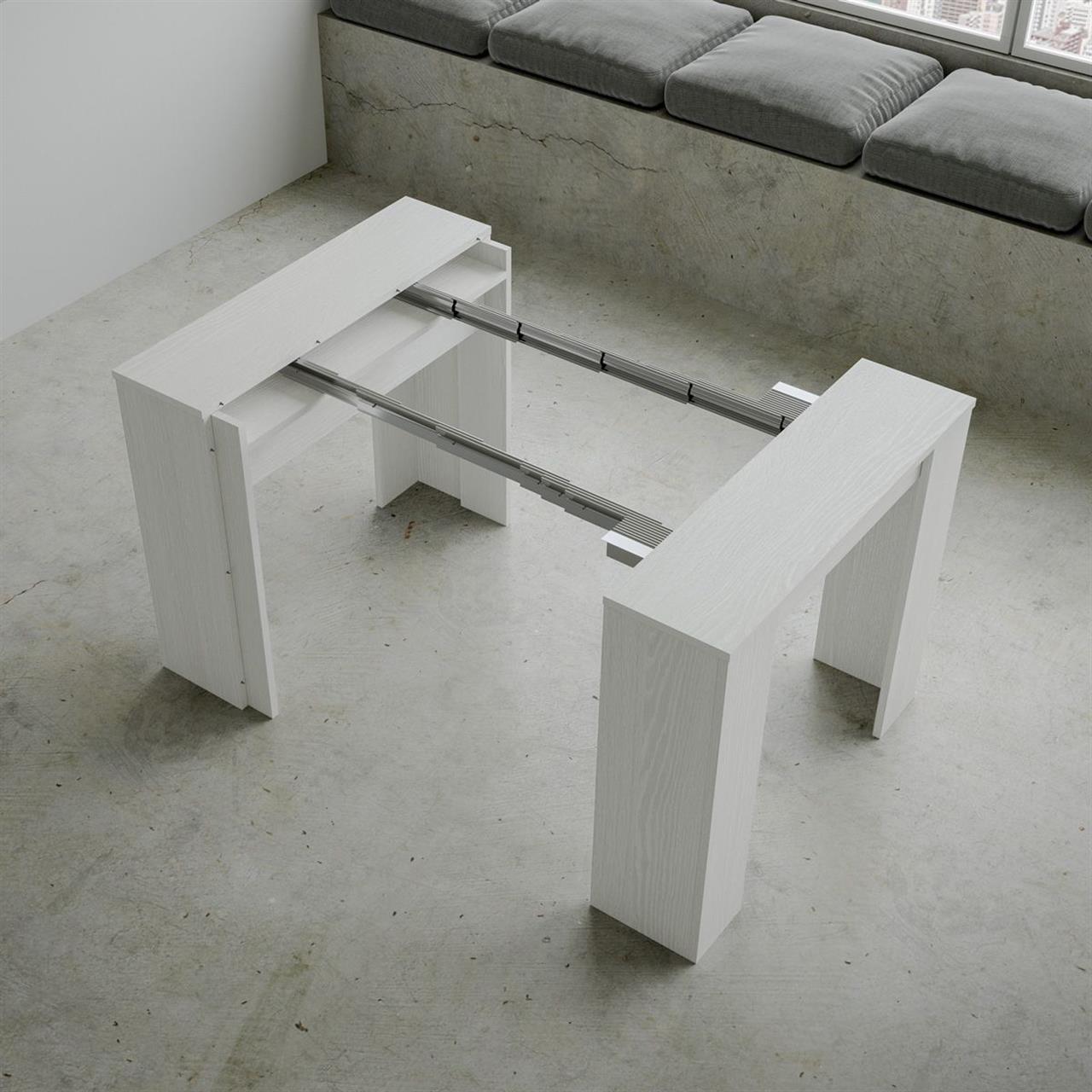 Consolle allungabile, versatile e robusta, un complemento perfetto per ogni ambiente della casa: ingresso, cucina, sala da pranzo, soggiorno o corridoio. La consolle allungabile può essere facilmente trasformata in un ampio tavolo da pranzo lungo fino a 308 cm, in grado di ospitare 14 persone. Realizzata con pannelli in nobilitato. Il sistema di allunghe con guide telescopiche in alluminio e il sostegno centrale integrato rendono la consolle stabile e robusta. Una volta che la consolle è chiusa, le allunghe devono essere riposte altrove.