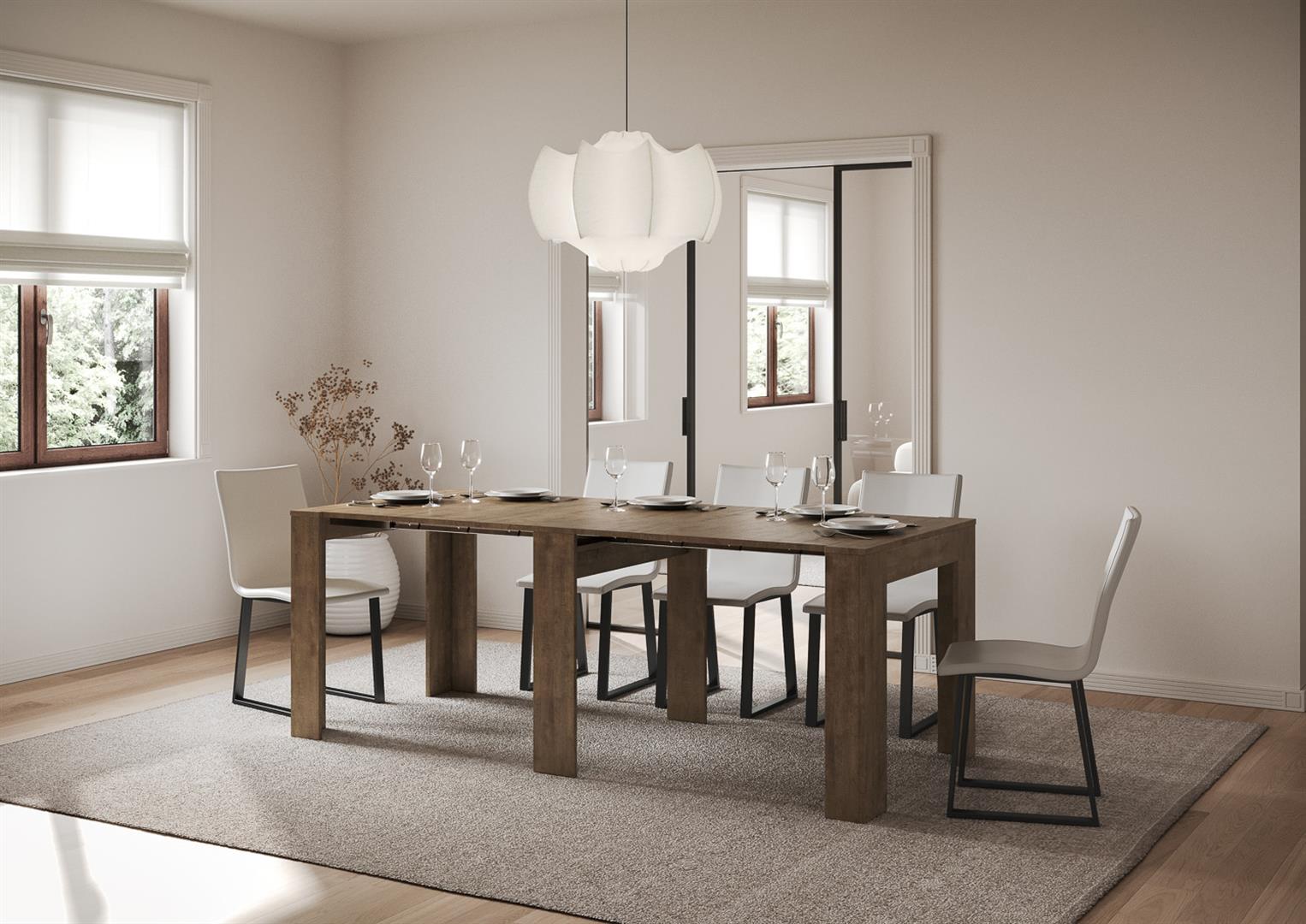 Consolle allungabile, versatile e robusta, un complemento perfetto per ogni ambiente della casa: ingresso, cucina, sala da pranzo, soggiorno o corridoio. La consolle allungabile può essere facilmente trasformata in un ampio tavolo da pranzo lungo fino a 211 cm, in grado di ospitare 10 persone. Realizzata con pannelli in nobilitato. Il sistema di allunghe con guide telescopiche in alluminio e il sostegno centrale in dotazione rendono la consolle stabile e robusta. Una volta che la consolle è chiusa, le allunghe da 62×86 cm trovano posto all'interno della struttura della consolle.