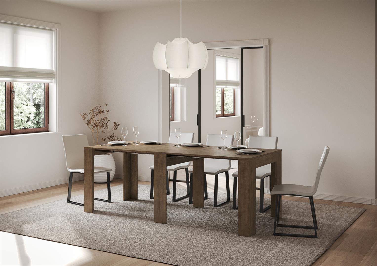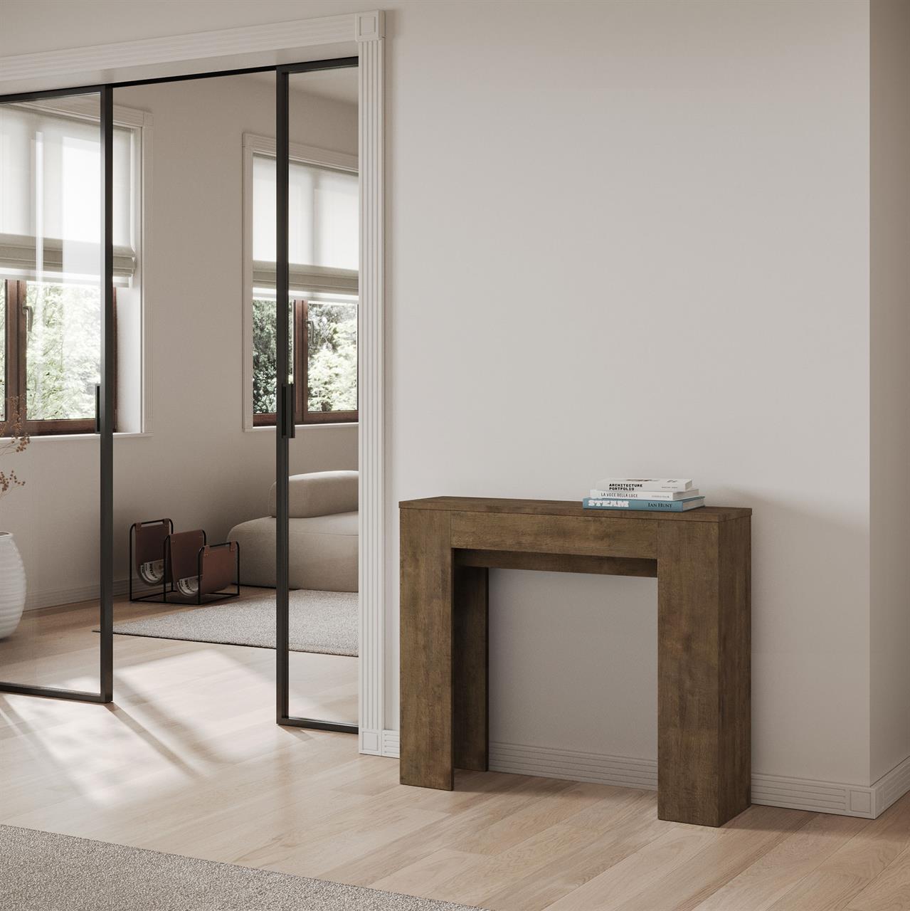 Consolle allungabile, versatile e robusta, un complemento perfetto per ogni ambiente della casa: ingresso, cucina, sala da pranzo, soggiorno o corridoio. La consolle allungabile può essere facilmente trasformata in un ampio tavolo da pranzo lungo fino a 181 cm, in grado di ospitare 8 persone. Realizzata con pannelli in nobilitato. Il sistema di allunghe con guide telescopiche in alluminio e il sostegno centrale in dotazione rendono la consolle stabile e robusta. Una volta che la consolle è chiusa, le allunghe devono essere riposte altrove.