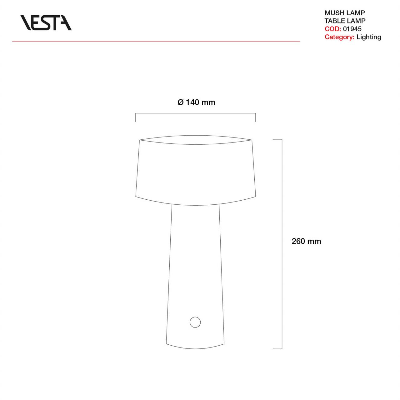 In polimero termoplastico, diametro 14cm altezza 26cm. Modulo 36 led 3W 200lm 3000°K, max 5W battery, 5V. Ricaricabile, autonomia 8 ore. Base ricarica NON INCLUSA nel prezzo.