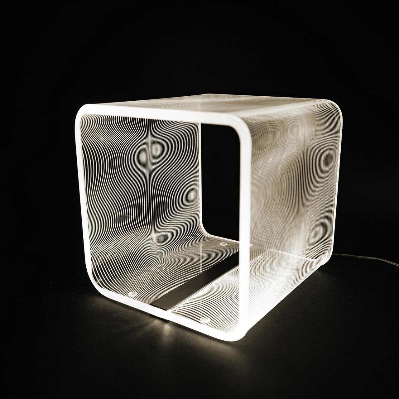 Lampada da tavolo in cristallo acrilico SOLID a luce calda, fantasia FLOTS, dimensioni 23x23x23 cm. Marcatura a laser, design Karim Rashid, catalogo Vesta Home, codice 0818001-3K