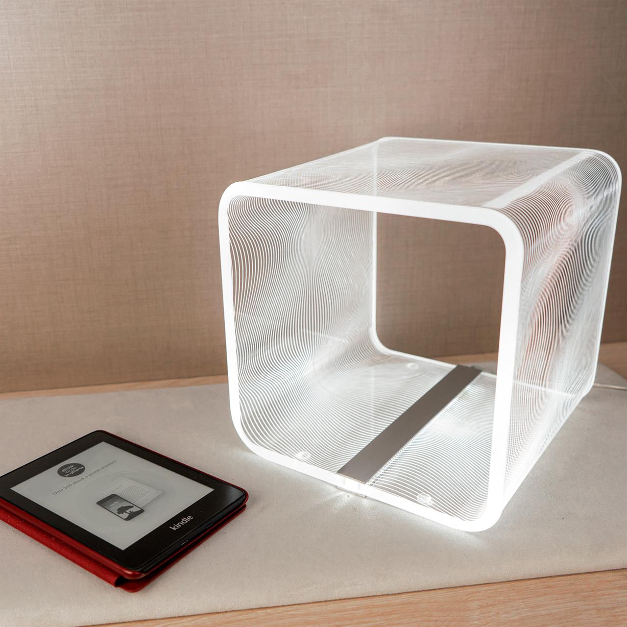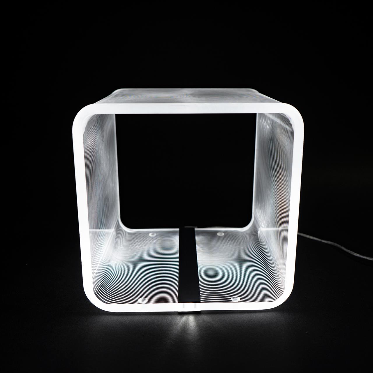 Lampada da tavolo in cristallo acrilico SOLID a luce fredda, fantasia FLOTS, dimensioni 23x23x23 cm. Marcatura a laser, design Karim Rashid, catalogo Vesta Home, codice 0818001-6K