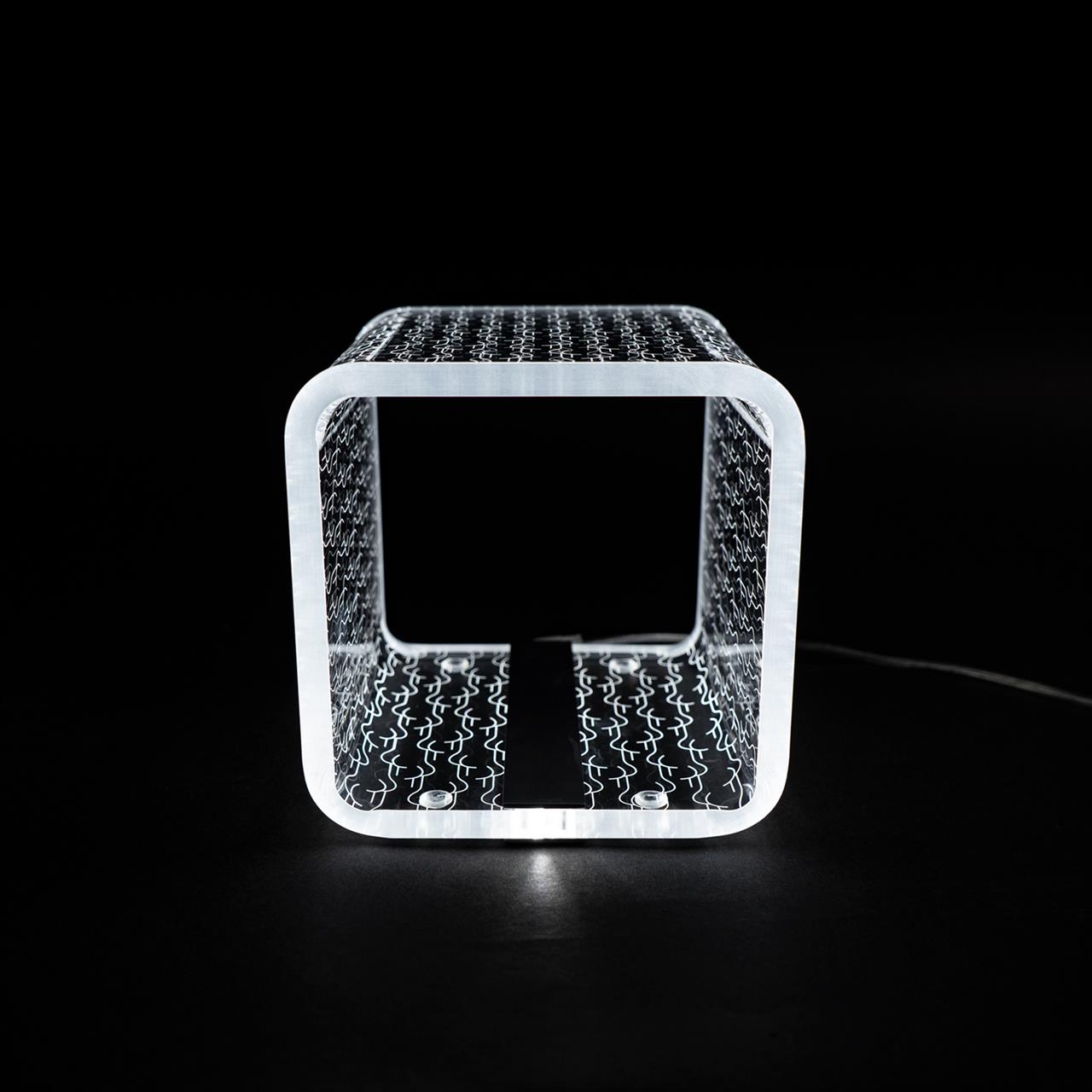 Lampada da tavolo in cristallo acrilico SOLID a luce fredda, fantasia TITS & BUTTS, dimensioni 15x15x15 cm. Marcatura a laser, design Karim Rashid, catalogo Vesta Home, codice 0817902-6K