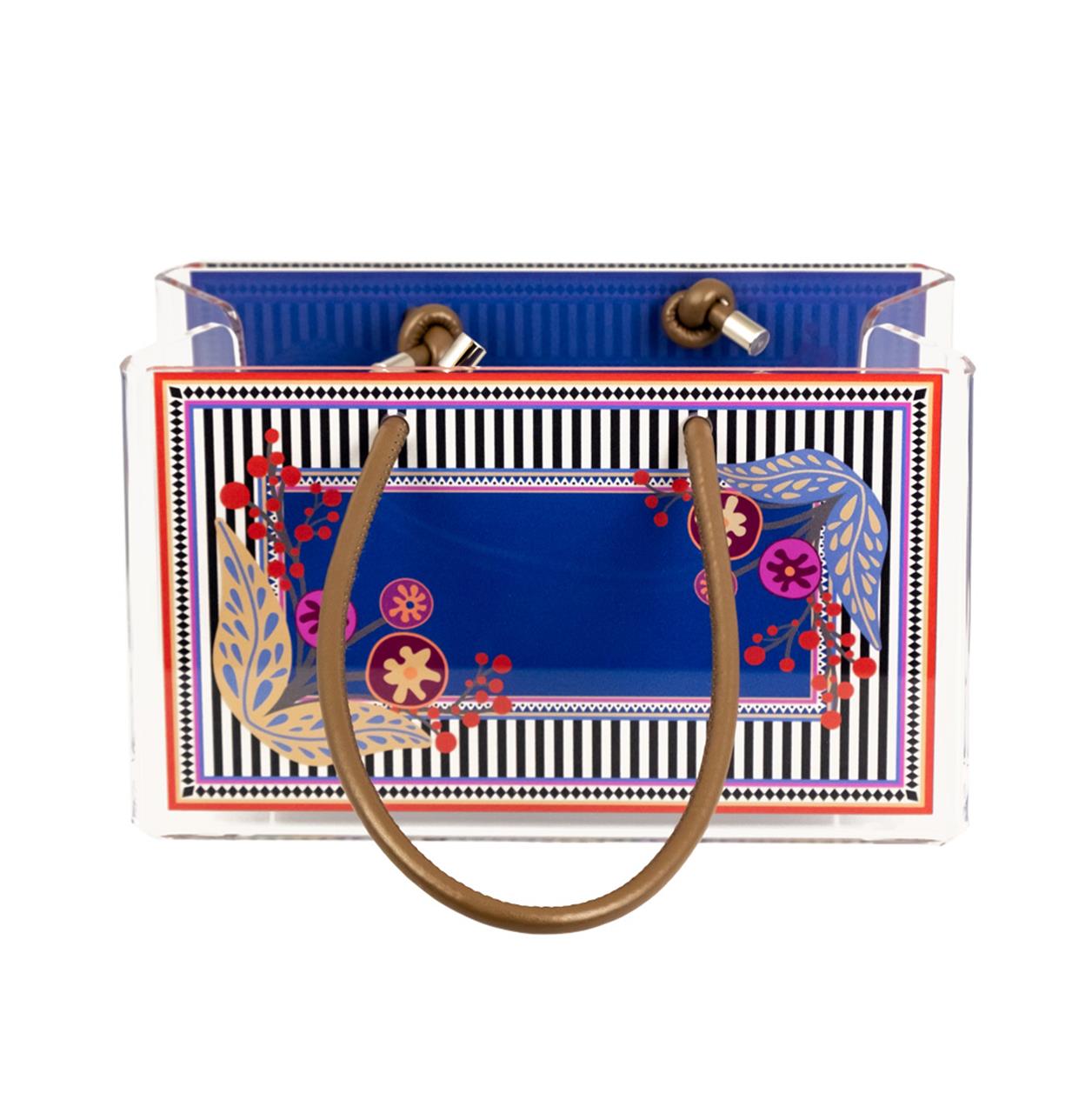 Elegante e pratico contenitore multiuso dal design originale, ispirato alla forma di una borsa. Realizzata in resistente cristallo acrilico, Bucarest si distingue per la sua estetica raffinata e per le grafiche stampate nel fronte, proprio come una vera borsa, disponibili in diverse varianti per adattarsi a ogni stile di arredamento. I manici in ecopelle, coordinati in base alla grafica scelta, aggiungono un tocco di eleganza e praticità, rendendo Bucarest non solo un complemento d'arredo decorativo, ma anche funzionale e facile da spostare. Ispirata ai colori e profumi dell'est Europa, Bucarest è perfetta come soluzione salvaspazio e decorativa.