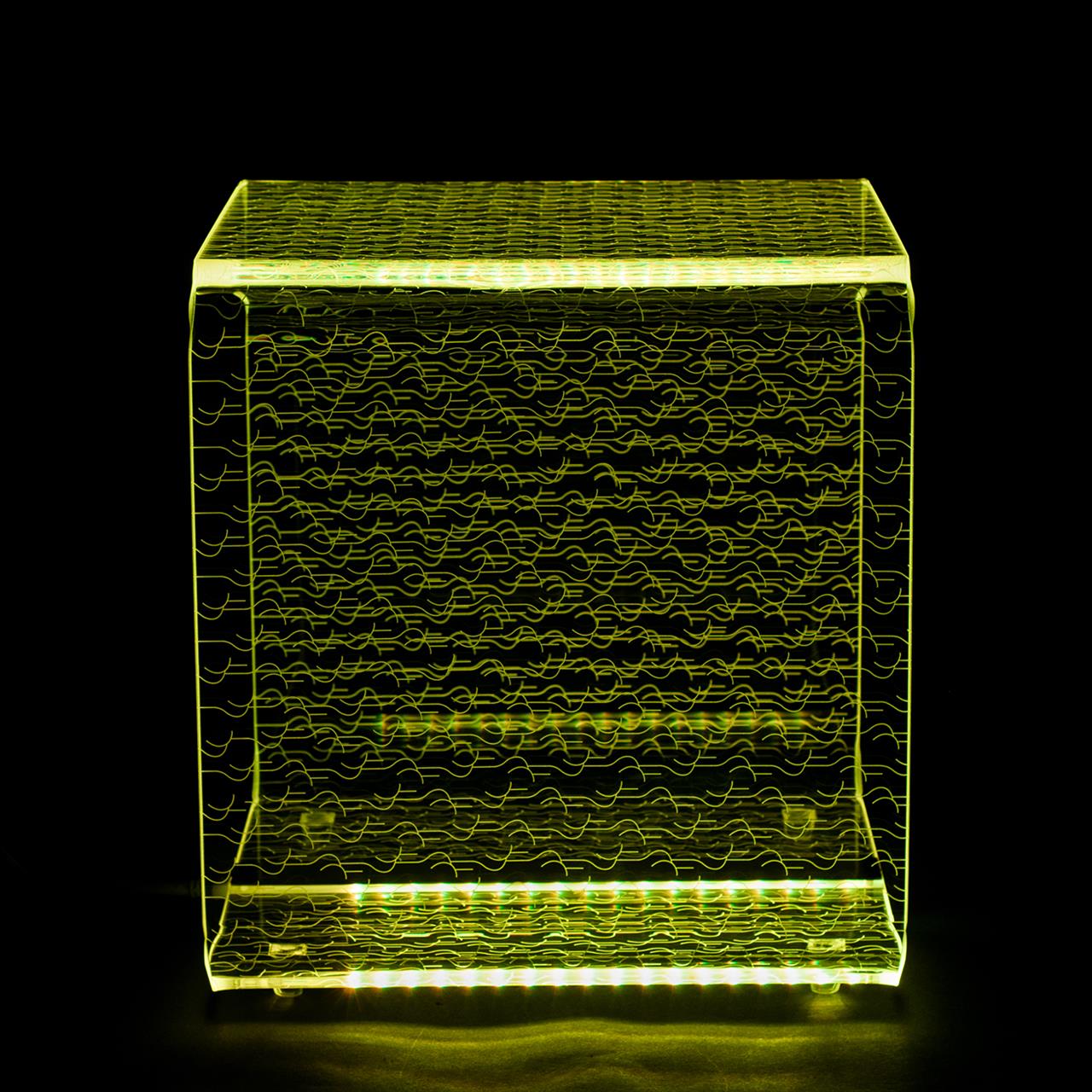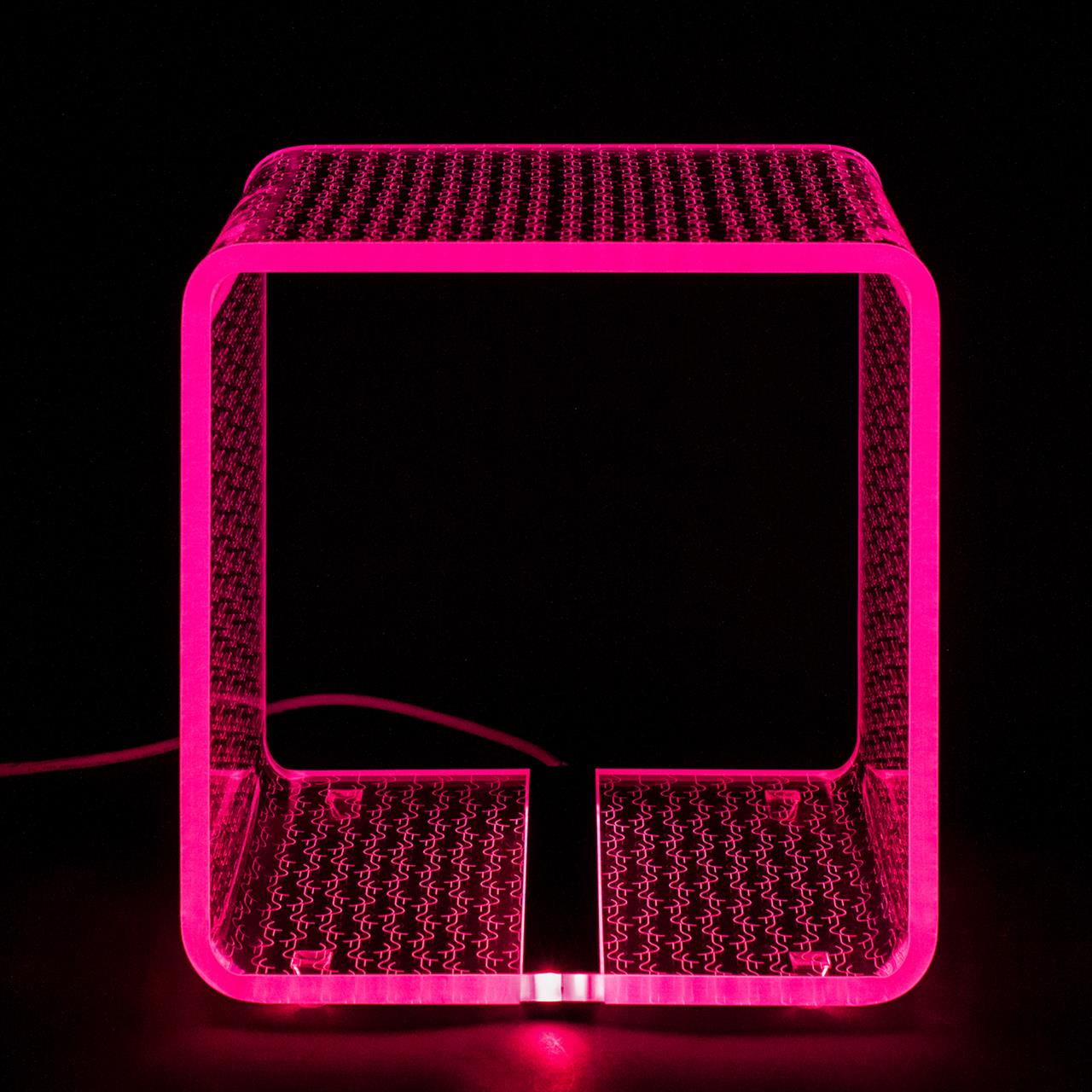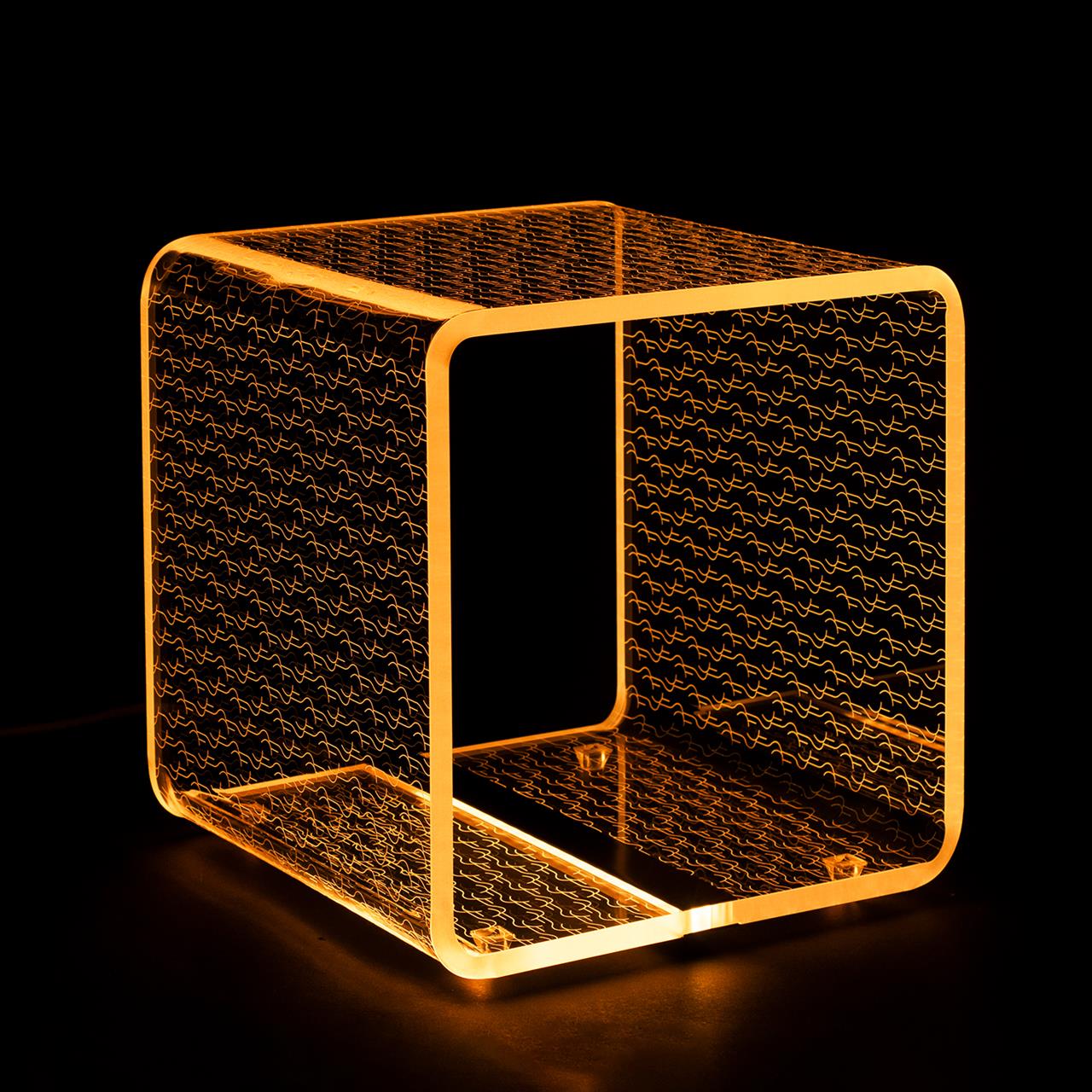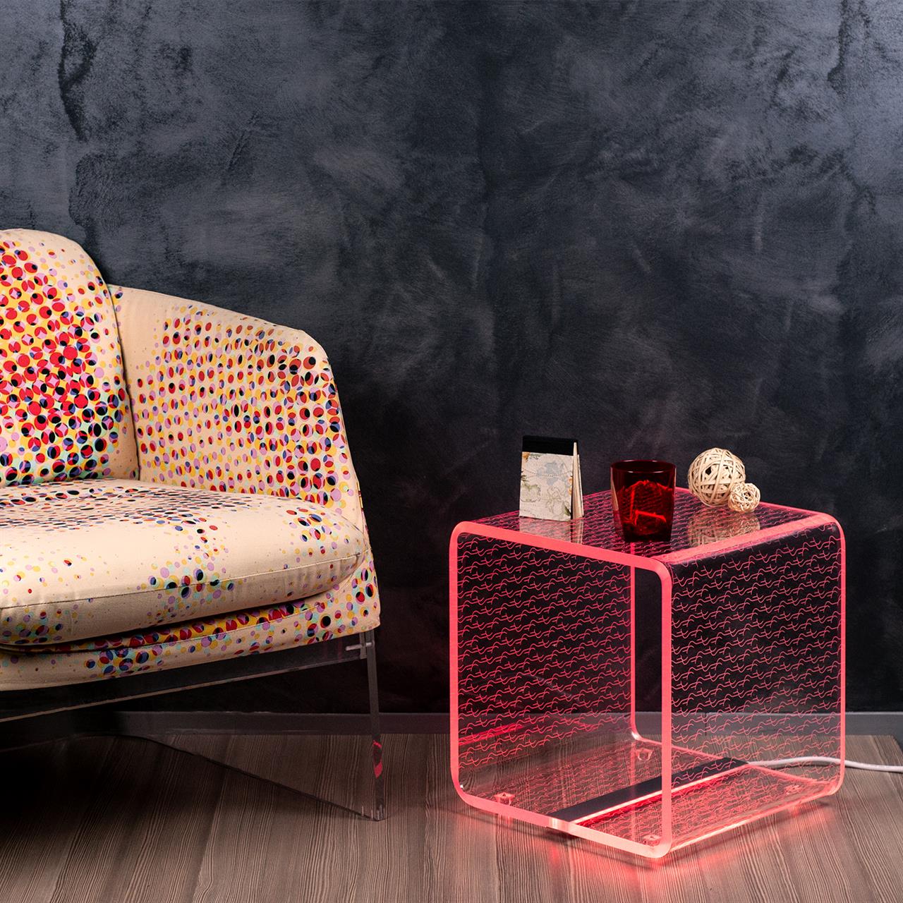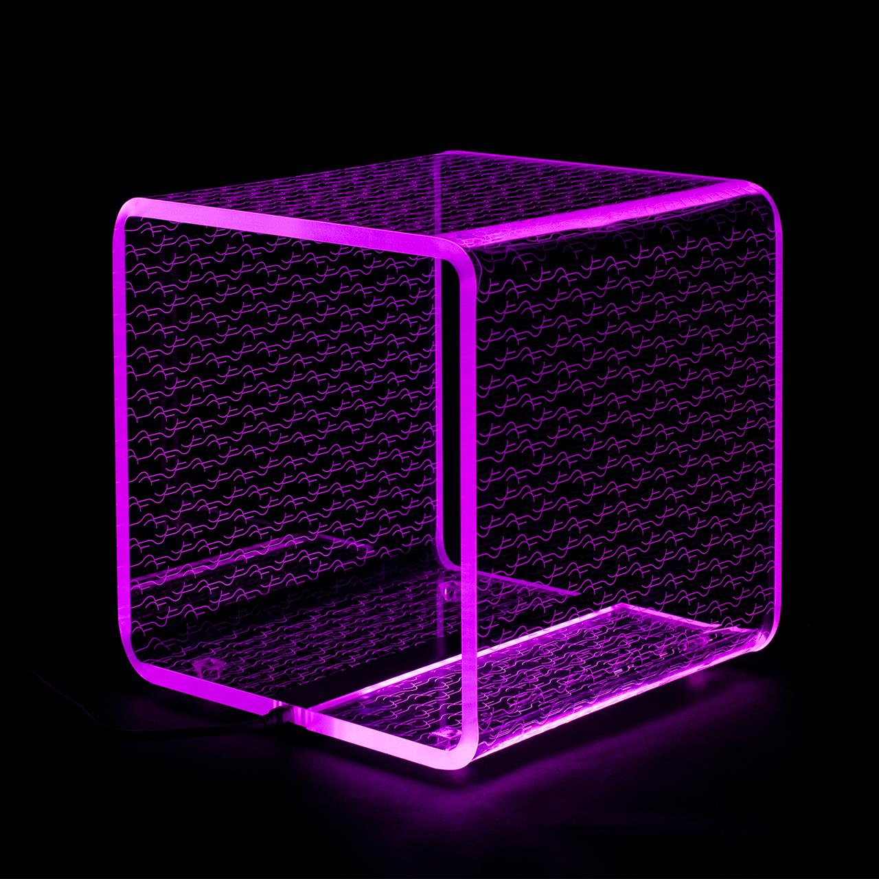 Tavolino luminoso in cristallo acrilico, illuminato a led, dal design creativo e innovativo. Fantasia Tits&Butts. Misura per lato 37.5 cm, versione RGB Full Spectrum. Design Karim Rashid