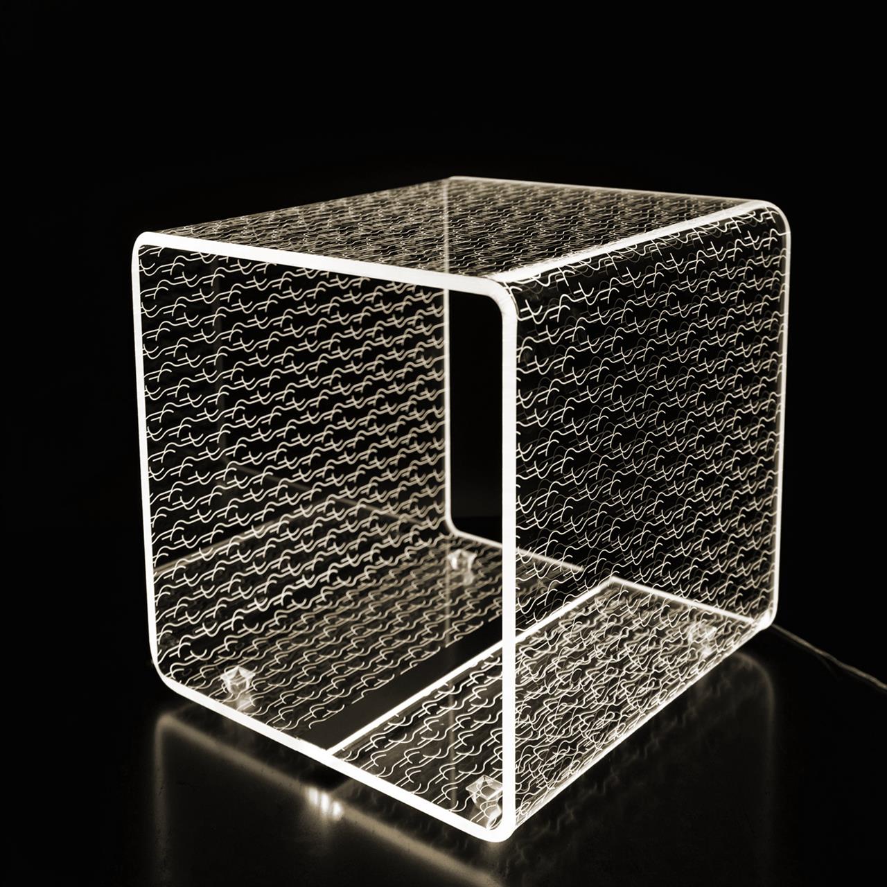 Tavolino luminoso in cristallo acrilico, illuminato a led, dal design creativo e innovativo. Fantasia Tits&Butts. Misura per lato 37.5 cm, luce calda 3k. Design Karim Rashid