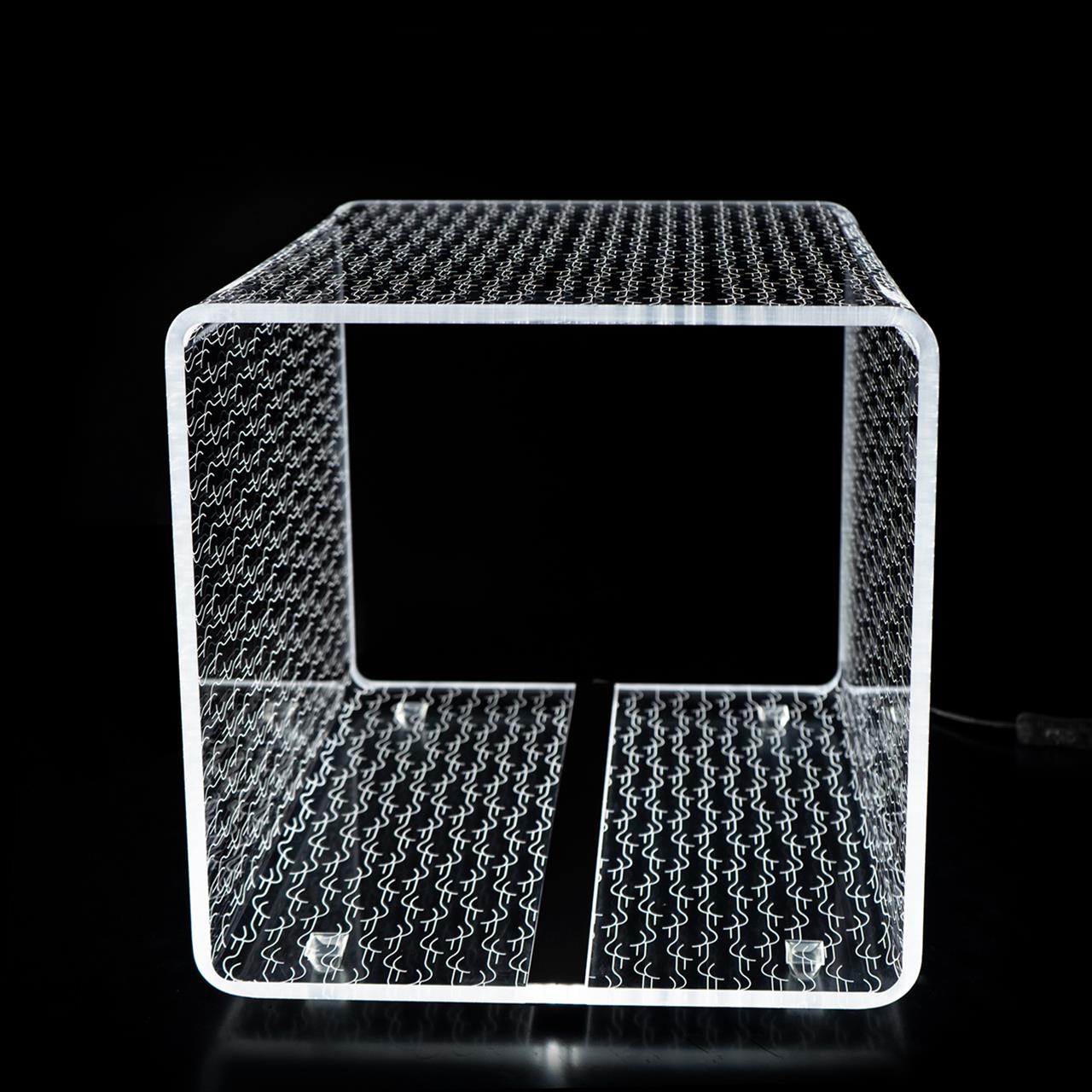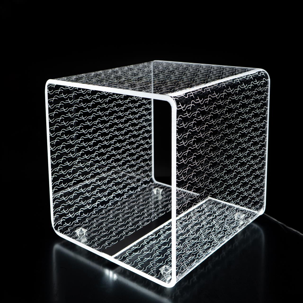 Tavolino luminoso in cristallo acrilico, illuminato a led, dal design creativo e innovativo. Fantasia Tits&Butts. Misura per lato 37.5 cm, luce fredda 6k. Design Karim Rashid
