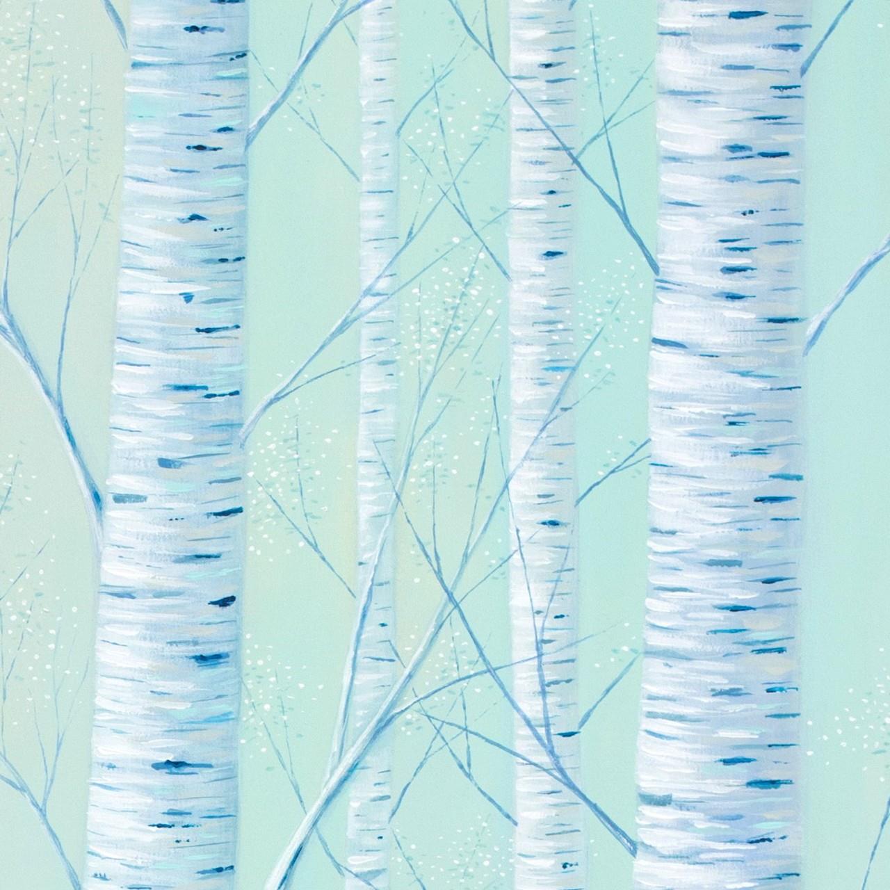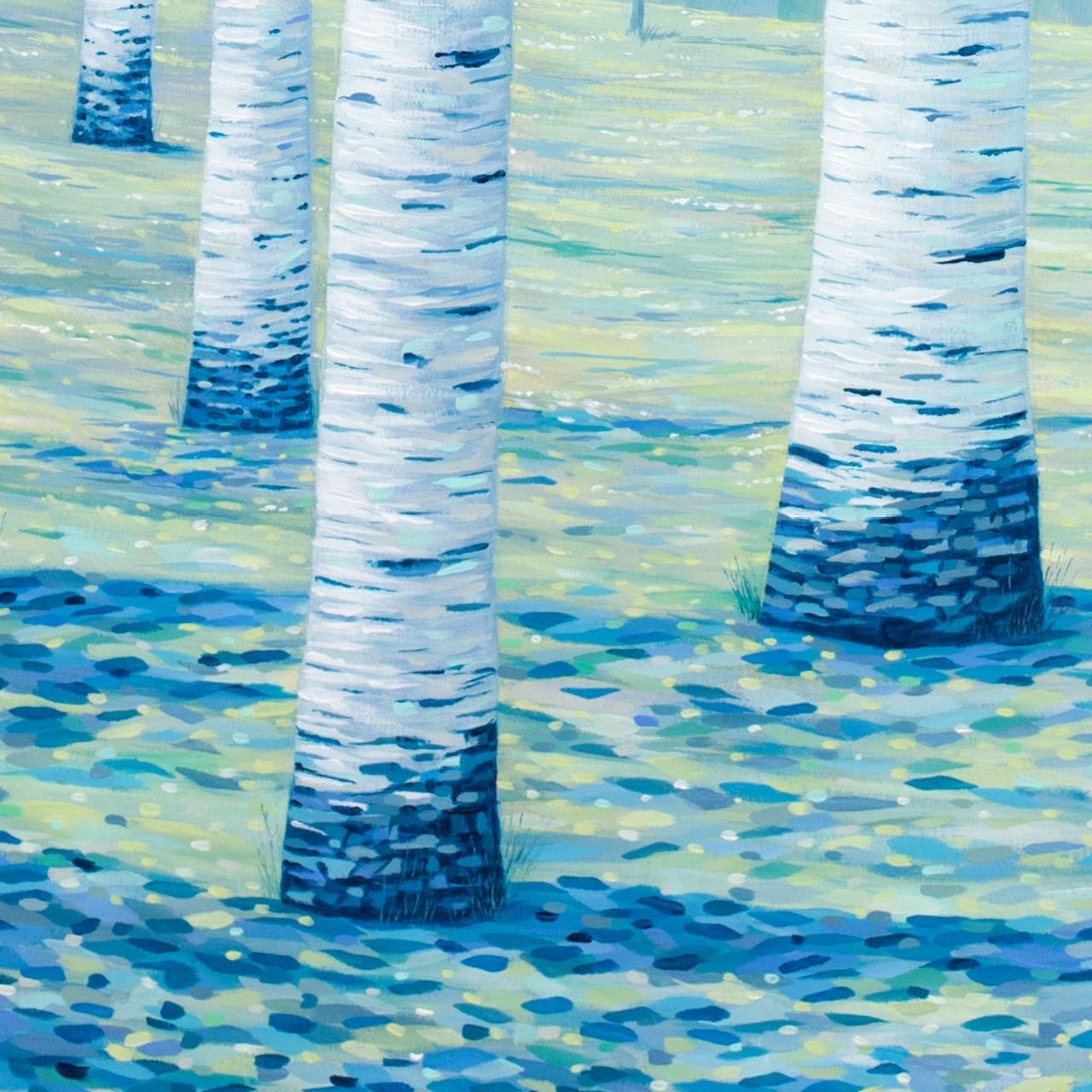 Un dipinto su tela che ritrae betulle immerse nelle prime ore del mattino. Dimensioni 70x100x4 cm. Realizzazione di Gabriele Casale, anno 2025.