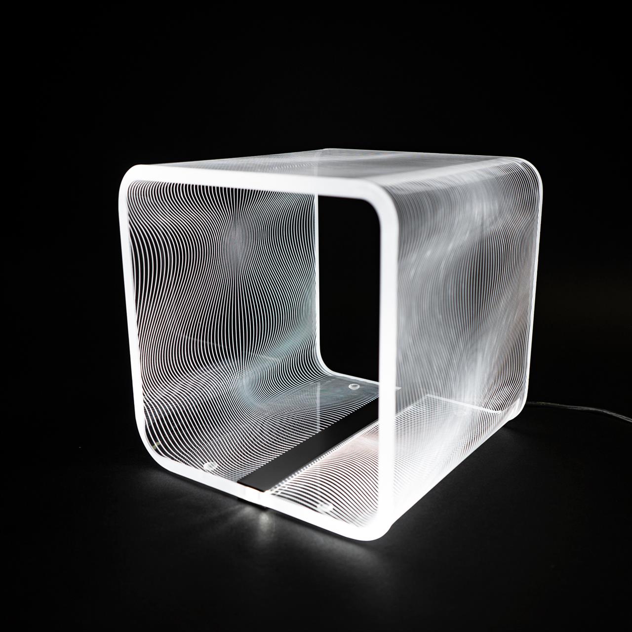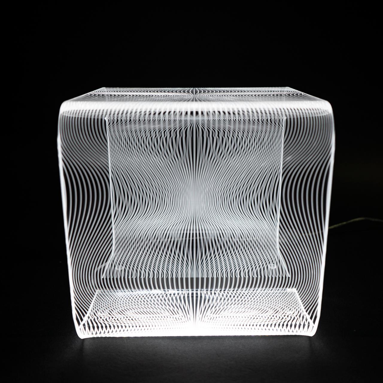 Lampada da tavolo in cristallo acrilico SOLID a luce fredda, fantasia FLOTS, dimensioni 23x23x23 cm. Marcatura a laser, design Karim Rashid, catalogo Vesta Home, codice 0818001-6K