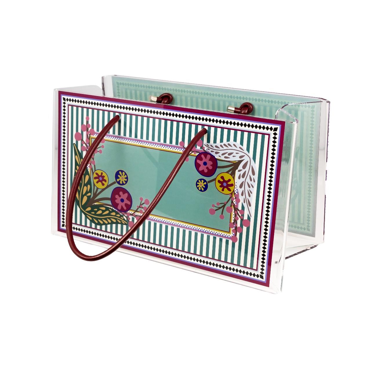 Bucarest Shopper pratico portaoggetti realizzato in cristallo acrilico e decorato con grafica stampata, collezione Vesta Home, fantasia Danubio, codice 04250DAN. Brugiatelli Design e KM Design.