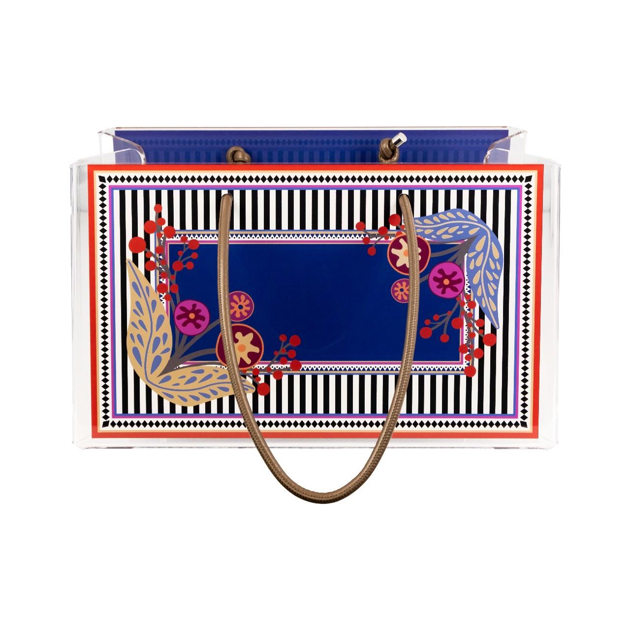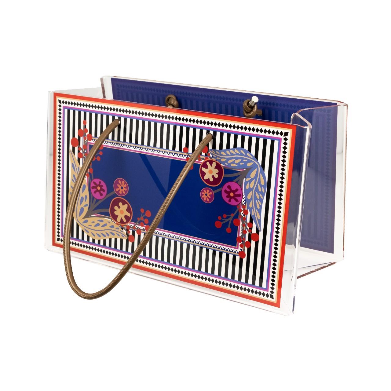 Bucarest Shopper pratico portaoggetti realizzato in cristallo acrilico e decorato con grafica stampata, collezione Vesta Home, fantasia Deva, codice 04250DEV. Brugiatelli Design e KM Design.