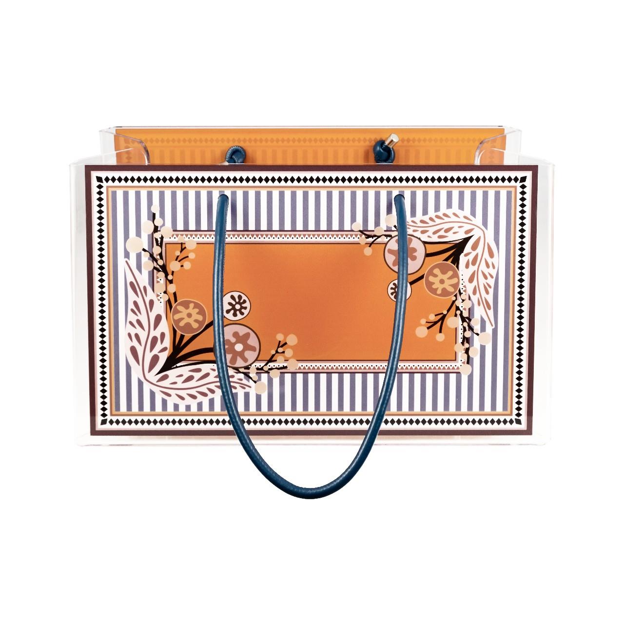 Elegante e pratico contenitore multiuso dal design originale, ispirato alla forma di una borsa. Realizzata in resistente cristallo acrilico, Bucarest si distingue per la sua estetica raffinata e per le grafiche stampate nel fronte, proprio come una vera borsa, disponibili in diverse varianti per adattarsi a ogni stile di arredamento. I manici in ecopelle, coordinati in base alla grafica scelta, aggiungono un tocco di eleganza e praticità, rendendo Bucarest non solo un complemento d'arredo decorativo, ma anche funzionale e facile da spostare. Ispirata ai colori e profumi dell'est Europa, Bucarest è perfetta come soluzione salvaspazio e decorativa.