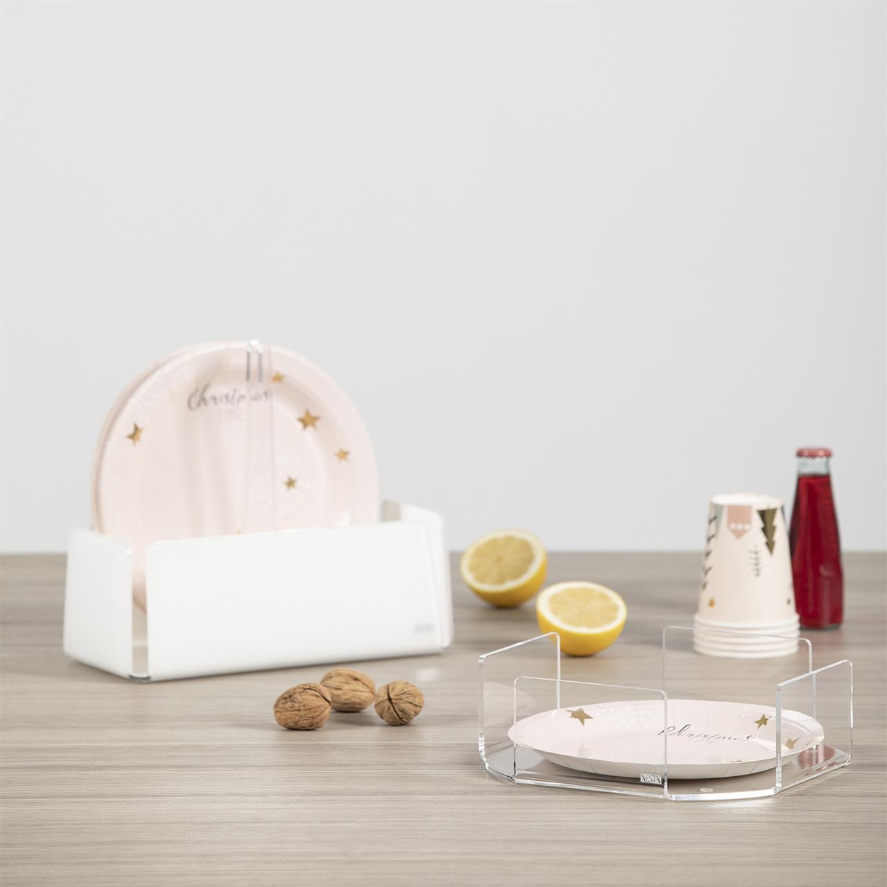 Portapiatti della linea Like Water, in cristallo acrilico, disponibile in 5 colori. Realizzato in cristallo acrilico, la struttura di questo portapiatti risulta molto resistente e leggera. Le sponde ai 4 lati impediscono ai piatti di scivolare fuori, e alla base sono presenti dei gommini antiscivolo per farlo restare stabile sulla tavola. Tieni in ordine i piatti di carta con questo pratico accessorio, ideale per feste e buffet. Perfetto anche da riporre nei cassetti, su una mensola, o nella credenza per organizzare le tue stoviglie usa e getta.